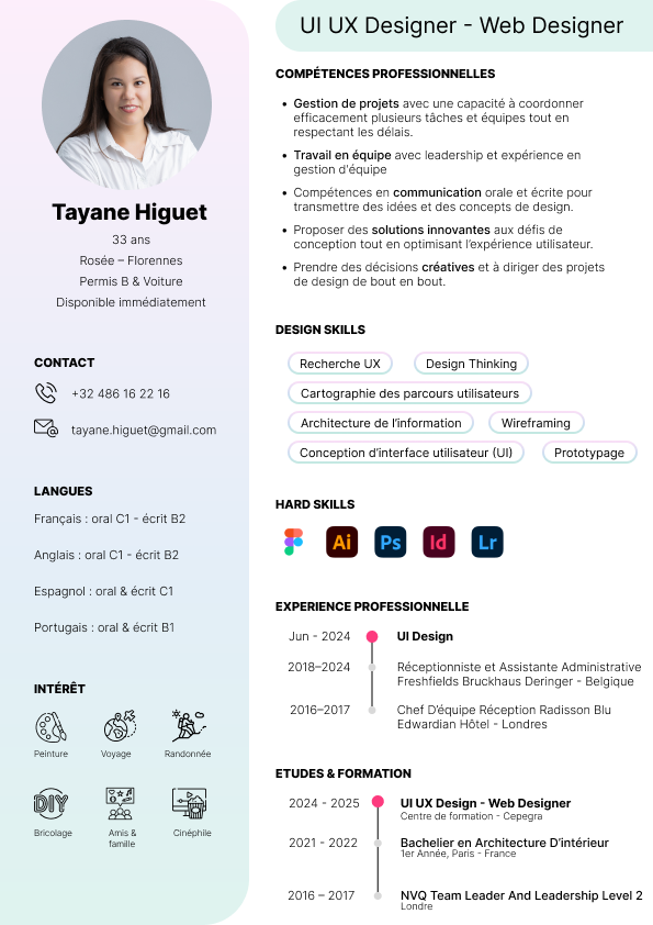 Graphiste passionnée, j'ai découvert le design en autodidacte pendant mon temps libre. Rapidement, j'ai voulu me spécialiser en web design et j'ai suivi une formation au Cepegra pour approfondir mes compétences. Aujourd'hui, je crée des expériences digitales uniques qui captivent et engagent votre audience.